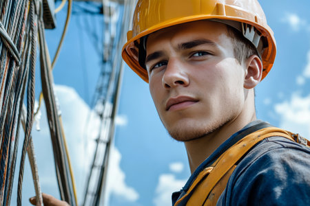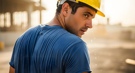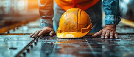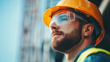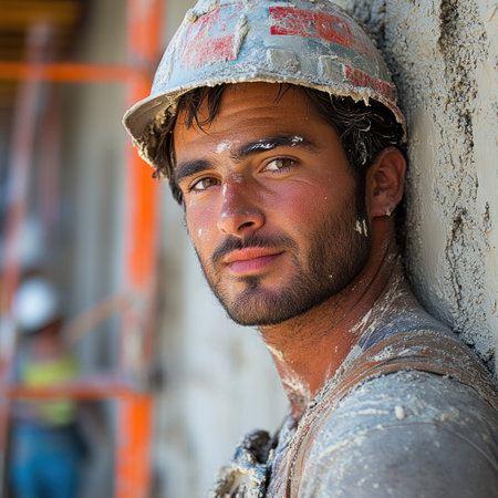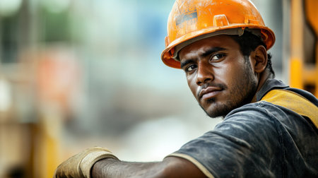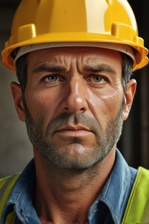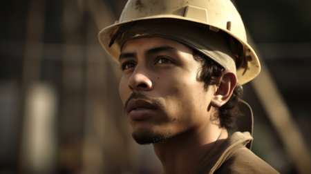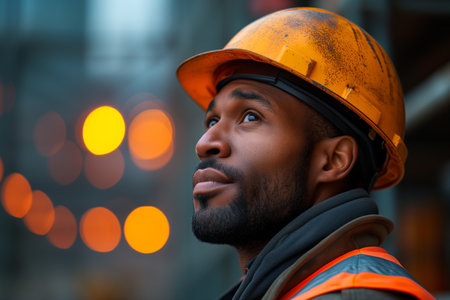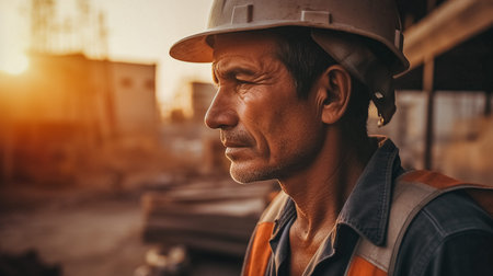 A seasoned professional in construction, wearing a safety helmet, gazes contemplatively into the shadows, illuminated by striking lighting that highlights his earnest expression.