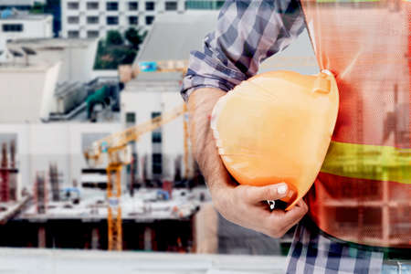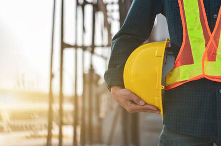 Helmet construction Engineer team. Men hands holding hardhat yellow work helmet in Civil Construction Engineering. Close up engineer man hold safety yellow worker helmet hard hat at Construction Site