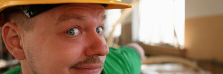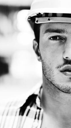 man in helmet young builder. focus point on the eye