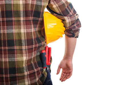Worker holding a hard hat on white background