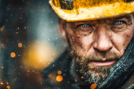 A focused laborer dons a bright yellow helmet, his intense gaze highlighting resilience as fiery sparks and gritty dust surround him in a gritty industrial scene.