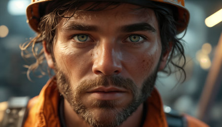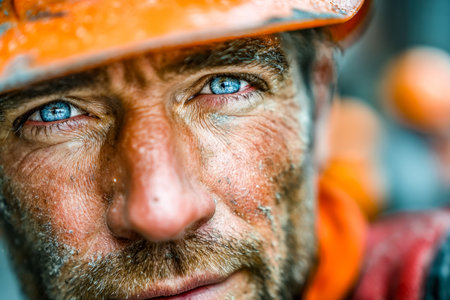 A gritty close-up revealing piercing blue eyes and rugged features, embodying unwavering resolve and the enduring spirit of a seasoned worker in demanding environments.