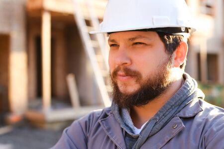 Close up portrait of foreman and builder wearing hardhat on construction site. Concept of professions and working abroad.