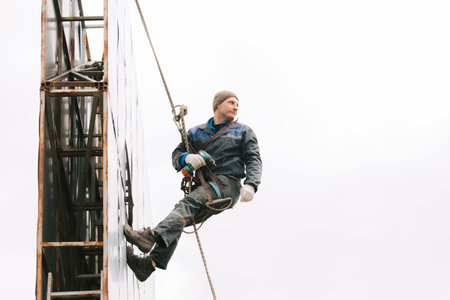 Male worker rope access industrial working at height tank oil wearing harness, helmet safety equipment rope.