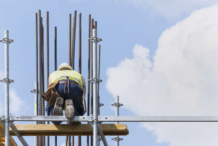 IPOH, MALAYSIA -JUNE 23, 2020: Construction workers fabricating steel reinforcement bar at the construction site. They tied it using the tiny wires before covering it up with timber formwork.