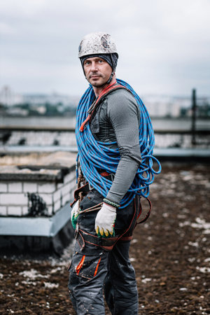 Industrial climber in helmet and overall working on height. Risky job. Professional worker
