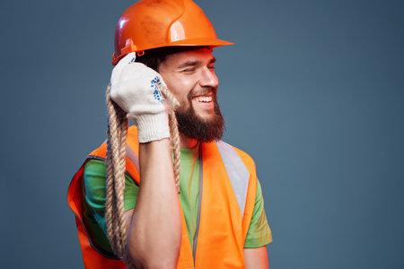 Construction worker. Cropped photo of male professional builder in working uniform with construction tools holding a safety red helmet while standing outdoor of construction site