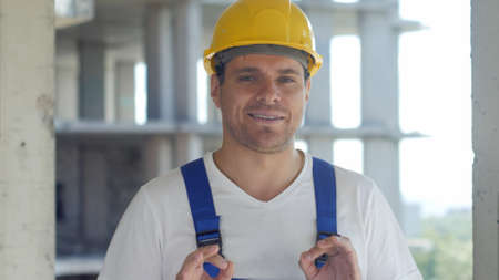 Portrait of construction worker wearing a yellow helmet looks instruments project standing at building construction site.