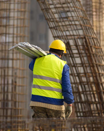 Builder in yeloow helmet transmits the metal parts of the structure at the construction site
