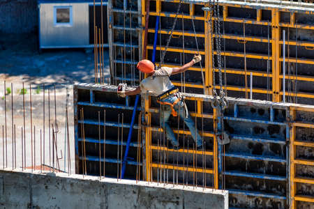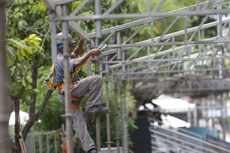 Male construction worker working at height Wear safety gear and safety harness to work at high heights at the construction site.