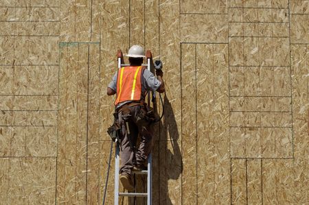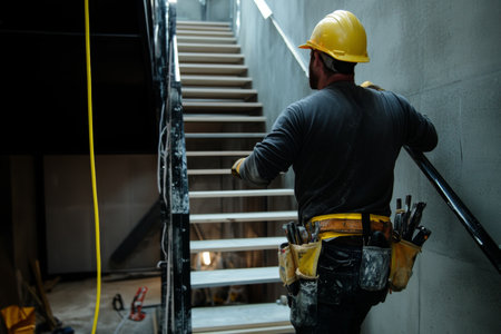 Construction worker in yellow helmet and tool belt building wooden staircase frame from side view
