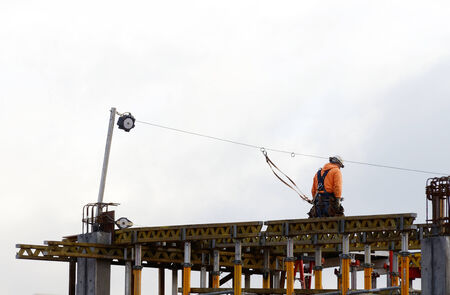 Construction workers are using safety equipment to prevent falls from heights or Fall arrestor device for worker with hooks for safety body harness on the construction site.