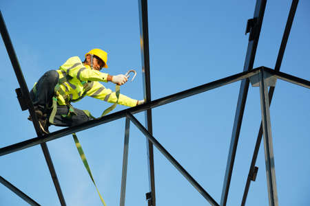 Construction workers in safety gear operating at heights with fall arrest devices on roof structure