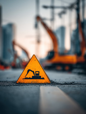 A triangular road under repair sign stands prominently while construction machinery works in the background at an urban location during daylight hours.