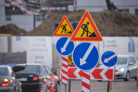 Roadworks warning traffic signs of construction work on city street and slowly moving cars