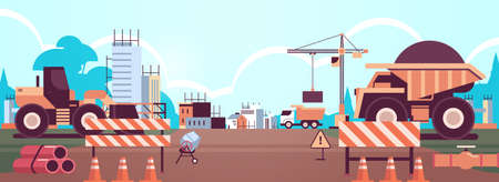 Large construction site with heavy construction machinery in metropolis captured during the early stage of mega construction project .