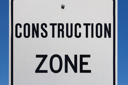 A yellow and black construction zone warning sign is prominently displayed, contrasting against a bright blue sky. The image captures workers and equipment, including a crane, at a construction site. The scene depicts an industrial environment with metal beams and offers potential applications in various commercial and editorial projects.