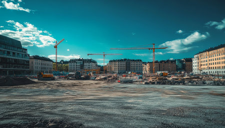 Busy construction site in Stockholm under a sunny sky with cranes and varied architecture