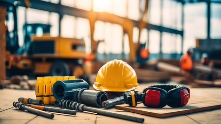 A collection of construction tools and safety equipment arranged on a wooden table, showcasing the essential items needed for any industrial project and worker safety.