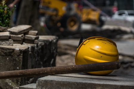 A vivid representation of essential construction site gear featuring a red safety helmet and yellow work gloves resting on a rugged surface, showcasing industrial readiness.