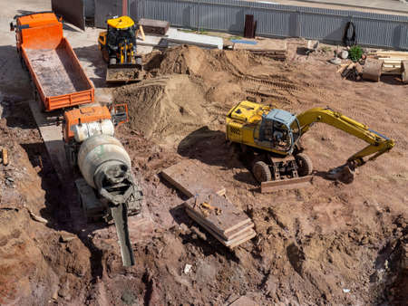 Empty construction site with truck, tractor and excavator and concrete mixer machine with aerial view.