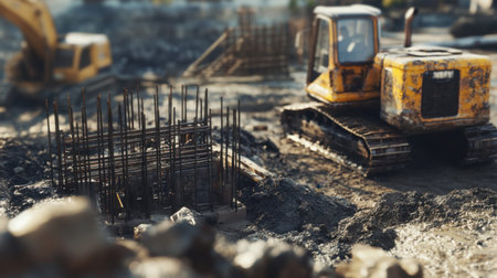 A busy construction site with various construction equipment and trucks engaged in building activities, Advanced construction machinery at work on a bustling site, AI Generated