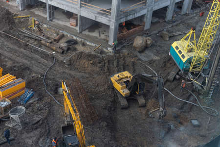 Construction site with heavy machines in the urban populated area. Engineering and building new shopping mall. Heavy machinery and industry concept.