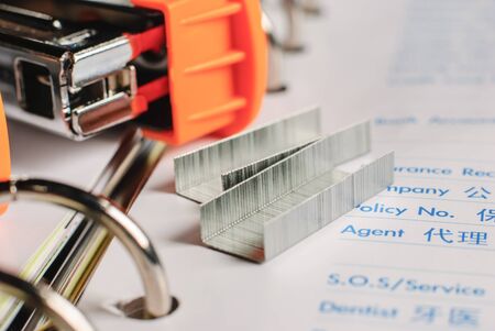 Stapler and staples lies on white paper on the office desk in the office