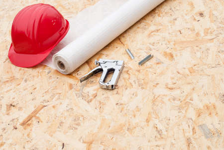 roll a vapor barrier, helmet and a stapler in the background OSB