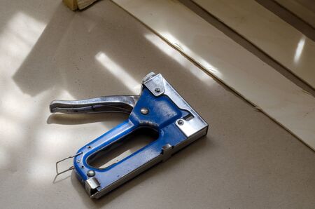 concept of furniture production and repair. Stapler and staples, working tool