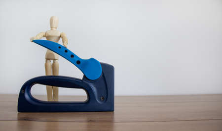 A construction stapler on a wooden table. Wooden model of human. Beautiful white background. Copy space.