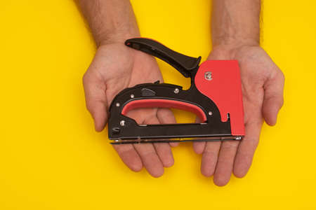 construction stapler gun in the hands. close-up