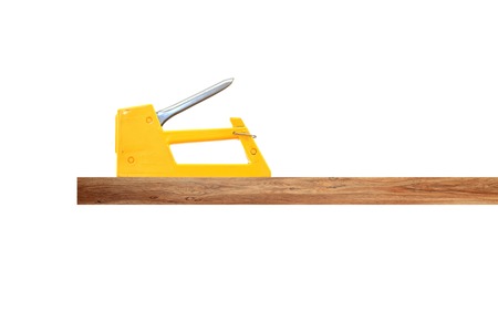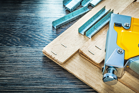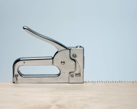 Metal stapler gun on wooden board copy space construction concept.