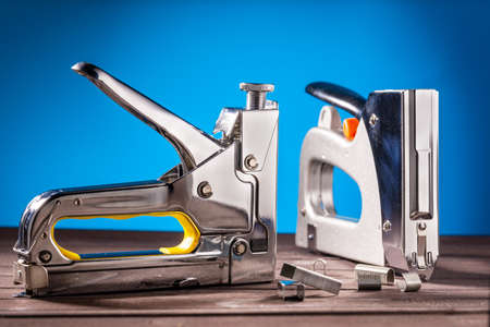 Gloved hands holding stapler construction tools. Work tools on blue background