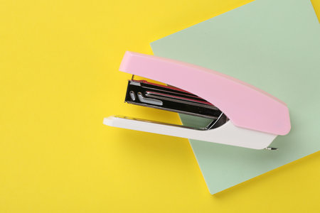 New stapler on yellow background, top view. Space for text