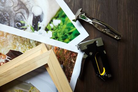 Photo canvas prints. Tools for wrapping. Photographs, stretcher bars, staple gun and canvas pliers on brown wooden table