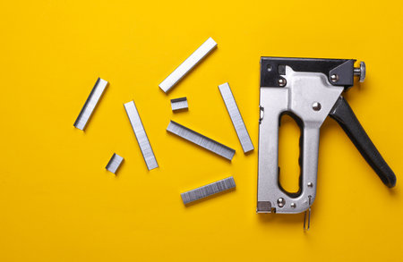 Construction stapler with staples on a yellow background