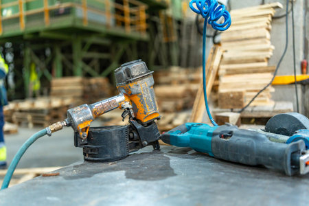 Close up shot of a nailer in a carpenter workshop