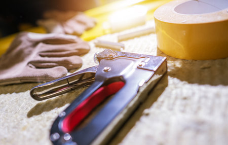 Closeup of Silver Industrial Staple Gun and Yellow Tape Lying in Bright Light on Construction Site. Contractor's Essential Working Tools.