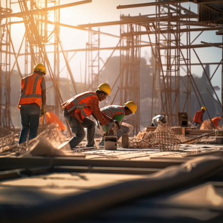 Construction workers on a construction site, diligently building structures and infrastructure, emphasizing the physical labor and teamwork required to bring architectural visions to life.