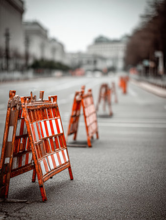 Road barriers stand on an abandoned street, indicating ongoing construction work in a deserted urban setting with overcast skies.