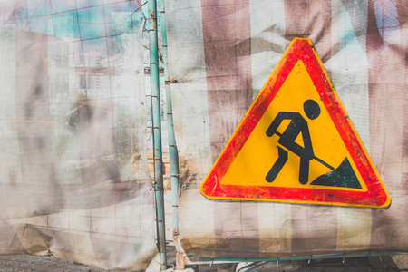 Roadworks warning sign ahead on street sidewalk. Close-up.