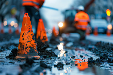 The image depicts a construction zone marked by warning signs and safety cones. Silhouettes of workers are visible, engaged in road work. The scene features a muted color palette, with a focus on yellows, oranges, and blacks, set against a blurred background. Suitable for projects related to infrastructure or safety.