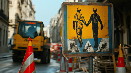 A traffic sign with an illustration of two men holding hands, next to construction cones and road work vehicles on the side street. The background is blurred to focus attention on the figures in front. In the style of David Mabille. --chaos 30 --ar 16:9 --v 6.1 Job ID: fe652ff7-82ce-45eb-8a92-28cefc30dd25