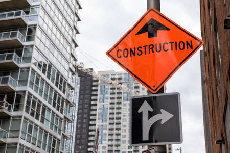 Under constraction road signs on the road. Orange sign Constraction on a street of a city. Street view, selective focus, nobody