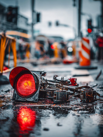 A rain-soaked urban street chaos unfolds as a toppled signal pole lies across glossy pavement, reflections shimmering underneath dark, cloudy skies.