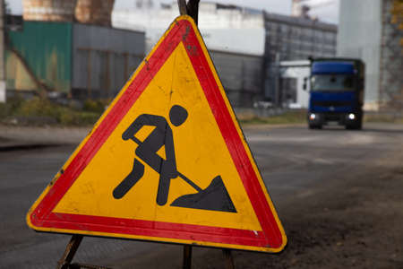 Sign of road work to inform traffic participants about carrying out repairs on road.