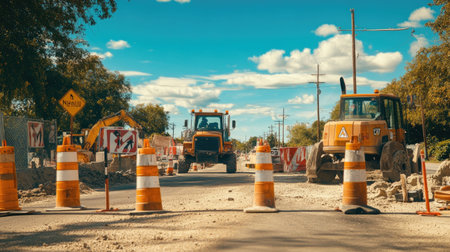 Cinematic view of a road construction site featuring cones and barriers in an empty work zone
