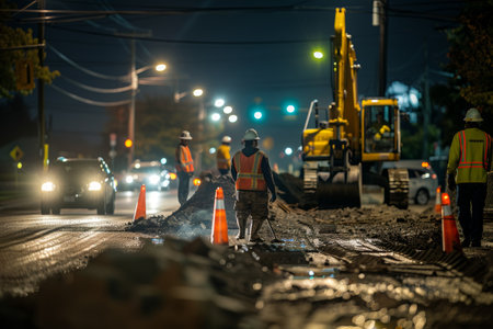 Workers in safety vests repair a city street at night amidst bright lights and heavy machinery.