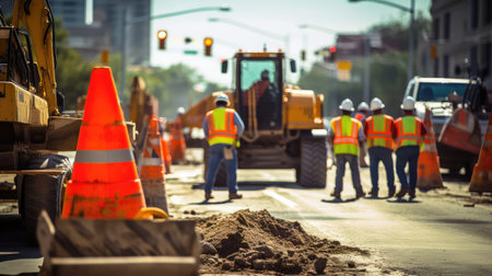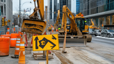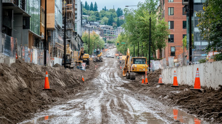 A bustling construction site in an urban environment featuring heavy machinery and workers, showcasing roadwork dynamics and infrastructure development.